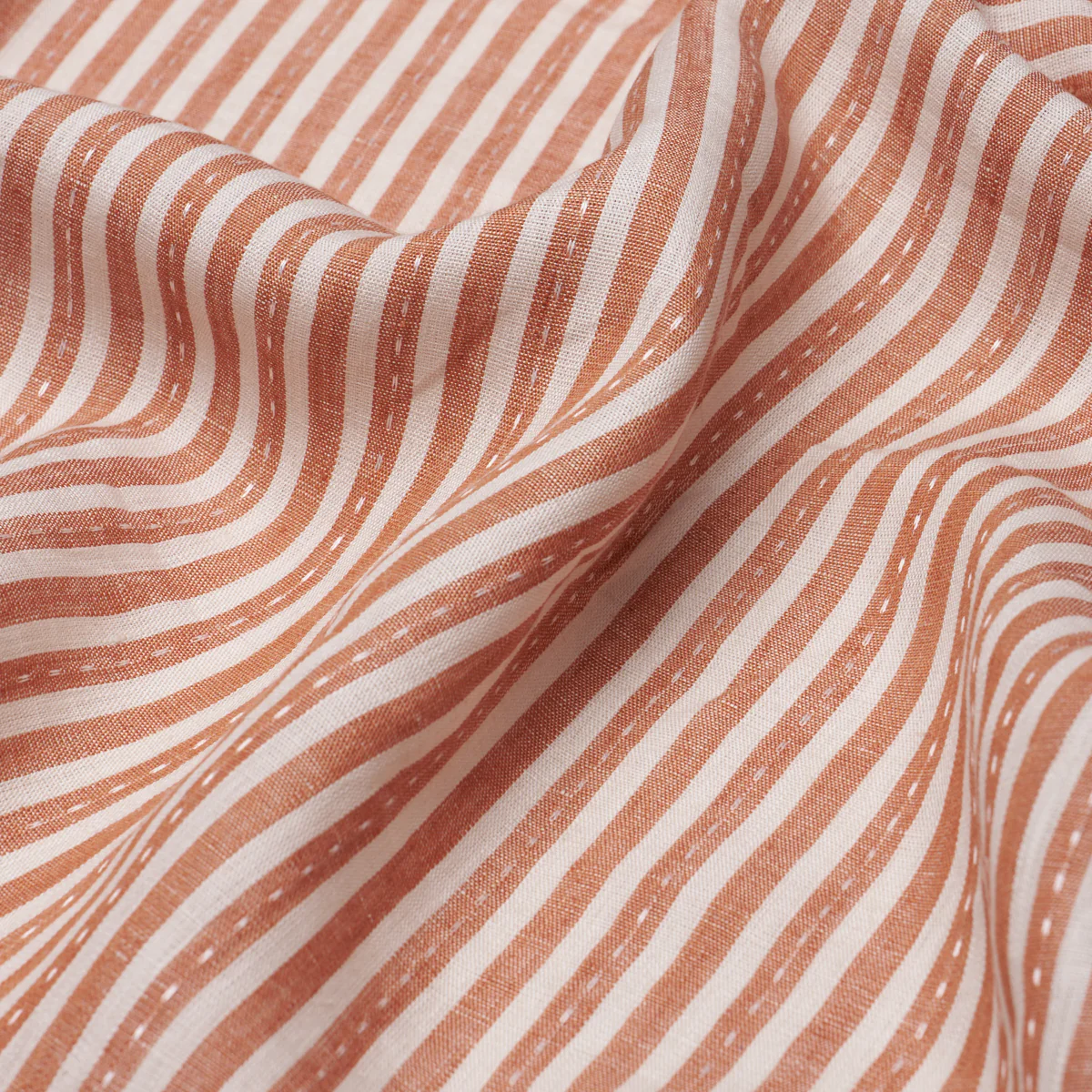 Select Schumacher Fabric Item 180595 pattern name Mathis Ticking Stripe color name Spice from the collection A Country Life. Enjoy this dazzling Fabric. Printed on a linen-hemp blend with a running-stitch detail, Mathis Ticking Stripe is an interesting, textural take on traditional mattress ticking. Casual and easy to live with, this is a classic, versatile fabric you can turn to again and again for upholstery, pillows, and window treatments. Cuttings available always. Fast Shipping Mahone's Fabric has been family owned in Lynchburg Va since 1969.