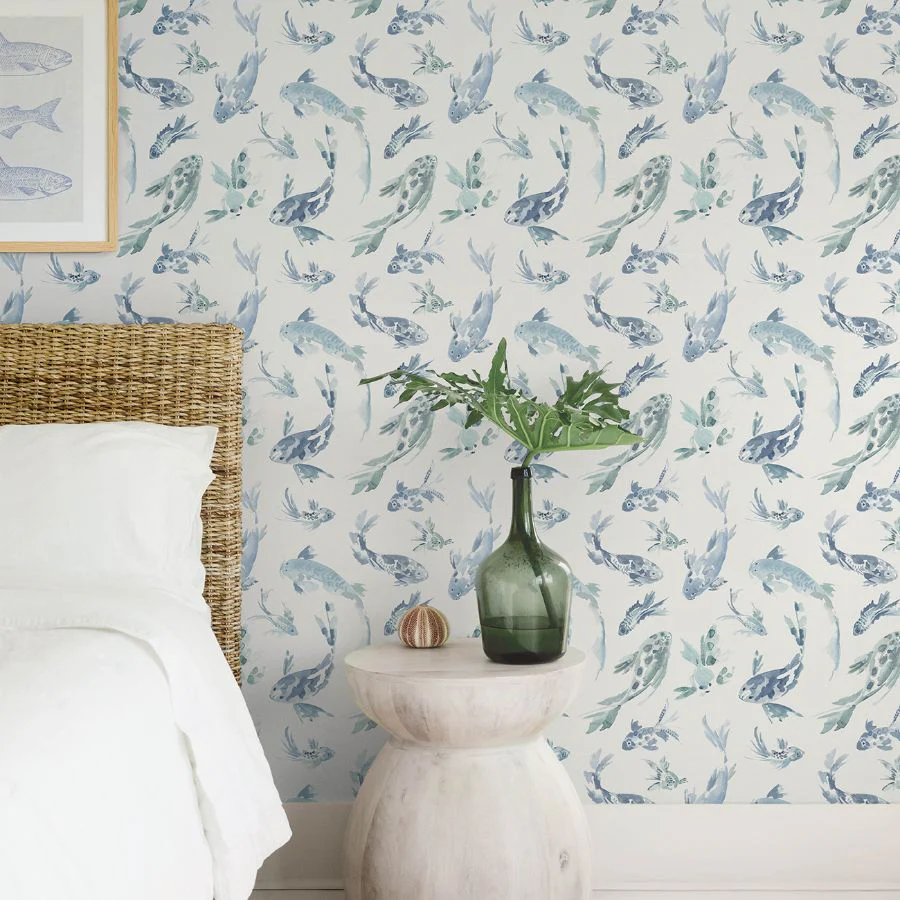 Acquire A-Street Wallpaper Pattern 4172-27500 pattern name Koi Blue Fish Wallpaper from the collection Sea Salt. Enjoy this inspiring wallpaper. Koi and goldfish swim in hypnotic circles, the design's flowing watercolors adding to its sense of movement and tranquility. Seen here in a cool palette of indigo, denim, teal, and sea green accentuated by subtle raised inks. Koi is an unpasted, non woven wallpaper measuring 20.5 inches wide by 33 feet long, covering approximately 56.4 square feet per roll.Cuttings available always online. Fast Shipping Mahone's Wallpaper has been family owned in Lynchburg Va since 1969.