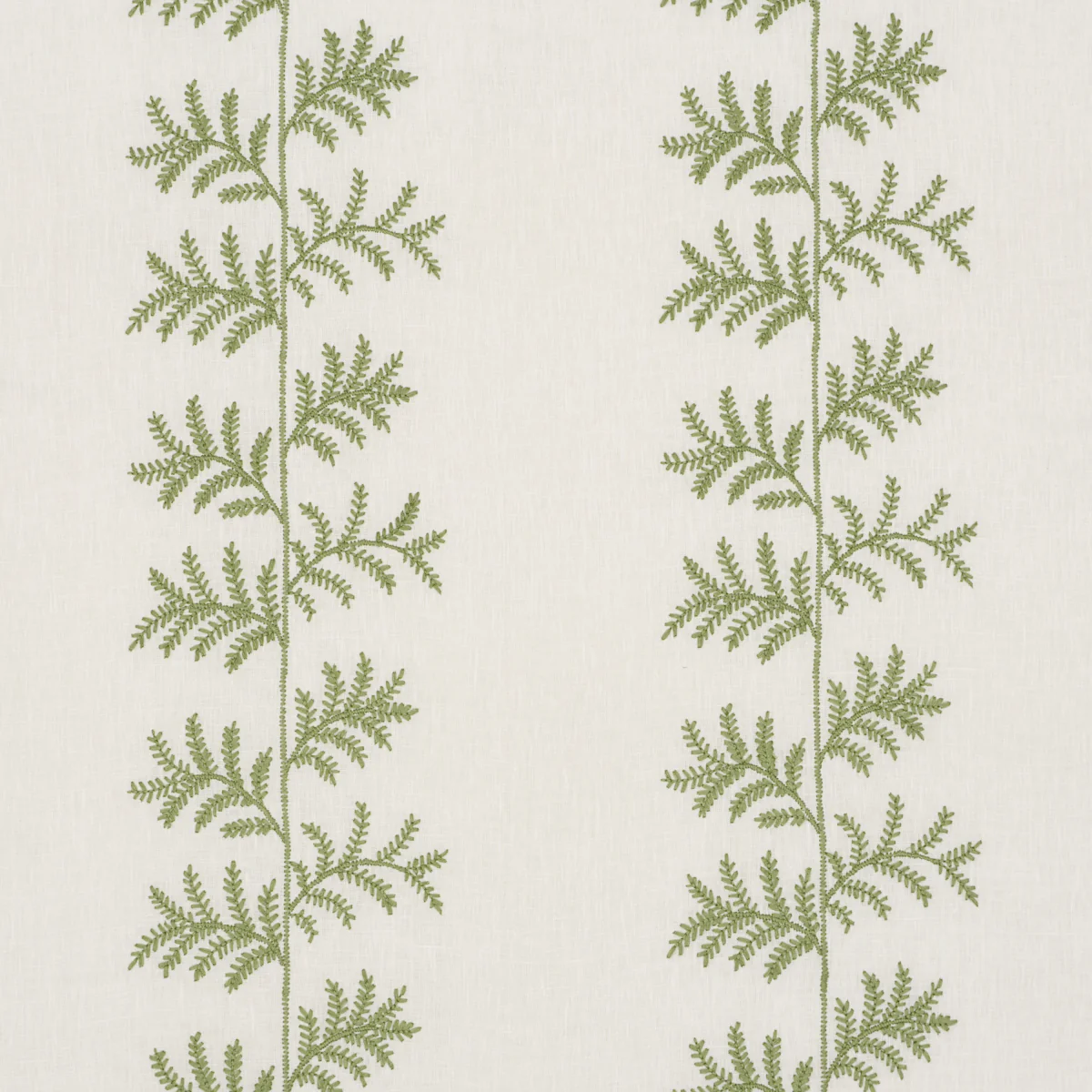 Find Schumacher Fabric Pattern number 85630 pattern name Eloise Embroidery color name Sage from the collection New Traditional. Enjoy this impeccable Fabric. Climbing fern fronds are stitched on a lightweight linen ground in Eloise Embroidery, a delicate medium-scale botanical stripe. The epitome of elegant simplicity, this delightful embroidered fabric filters light beautifully and works perfectly for window treatments. Also available as a wallpaper. Samples available. Fast Shipping Mahone's Fabric has been family owned in Lynchburg Va since 1969.