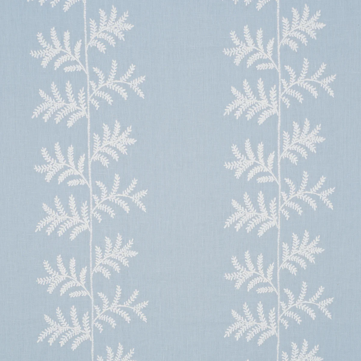 Purchase Schumacher Fabric Item 85632 pattern name Eloise Embroidery color name Sky from the collection New Traditional. Enjoy this inspiring Fabric. Climbing fern fronds are stitched on a lightweight linen ground in Eloise Embroidery, a delicate medium-scale botanical stripe. The epitome of elegant simplicity, this delightful embroidered fabric filters light beautifully and works perfectly for window treatments. Also available as a wallpaper. Swatches always available. Fast Shipping Mahone's Fabric has been family owned in Lynchburg Va since 1969.