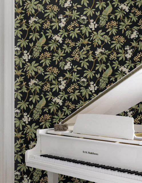 Shop Ronald Redding Wallpaper Product# MX9662 pattern name Peacock Estate from the collection Astoria. Enjoy this rare wallpaper. Regal peacocks and lively sparrows perch amidst branches laden with berries and blooms in timeless pattern Peacock Estate. Seen here in shades of sage, moss, ochre, light brown, white, and black with subtle metallic accents. This Peacock Estate Wallpaper measures approximately 27 inches wide by 27 feet long, measuring approximately 60.8 square feet per roll. Traditional and timeless meets modern refinement, with artfully crafted designs redefined in striking color palettes. Cuttings available always. Fast Shipping Mahone's Wallpaper has been family owned in Lynchburg Va since 1969.