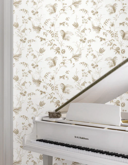 Search Ronald Redding Wallpaper Pattern MX9681 pattern name Floral Lace from the collection Astoria. Enjoy this enchanting wallpaper. Wildflowers intertwine with prairie grasses in airy and elegant design Floral Lace. Seen here inked in golden taupe against white. This Floral Lace Wallpaper measures approximately 27 inches wide by 27 feet long, measuring approximately 60.8 square feet per roll. Traditional and timeless meets modern refinement, with artfully crafted designs redefined in striking color palettes. Swatches available. Fast Shipping Mahone's Wallpaper has been family owned in Lynchburg Va since 1969.