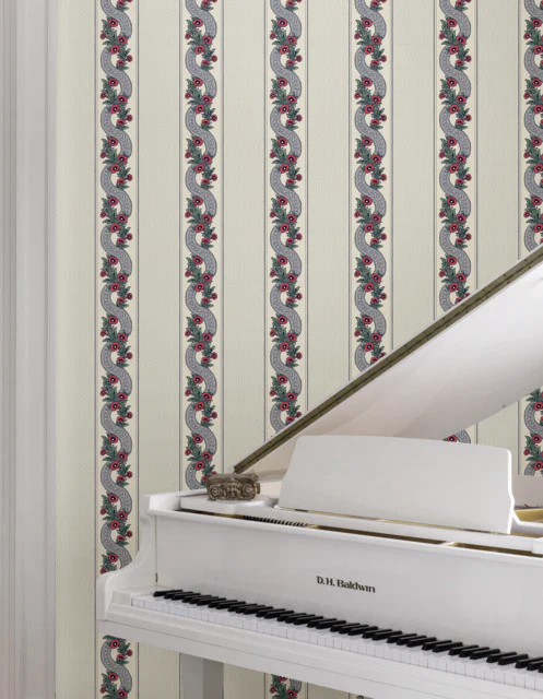 Looking for Ronald Redding Wallpaper SKU# MX9694 pattern name Abbey's Garland from the collection Astoria. Enjoy this dazzling wallpaper. Intertwining columns of vines and campanula flowers alternate with wide bands embellished with dotted zigzags in pattern Abbey's Garland. Featured here with red blooms, moss and blue vines, and sky blue stippling against a cream ground. This Abbey's Garland Wallpaper measures approximately 27 inches wide by 27 feet long, measuring approximately 60.8 square feet per roll. Traditional and timeless meets modern refinement, with artfully crafted designs redefined in striking color palettes. Swatches always available online. Fast Shipping Mahone's Wallpaper has been family owned in Lynchburg Va since 1969.